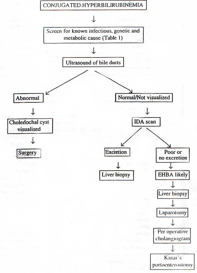 The approach to persistent conjugated hyperbilirubinemia is directed by the age at presentation. Two categories can be defined; the cholestatic baby (< 1year) and the older child ( >1 year). Although there is an overlap in the disorders producing persistent jaundice in these two categories, the approach is the distinctive.The approach is directed by the clinical features and employs many different investigational methods including biochemistry, hematology, microbiology , radiology, nuclear medicine and histology. As the clinical presentation of many diseases is similar, it is appropriate to perform a variety of first line tests, proceeding to more complex investigations only when indicated.